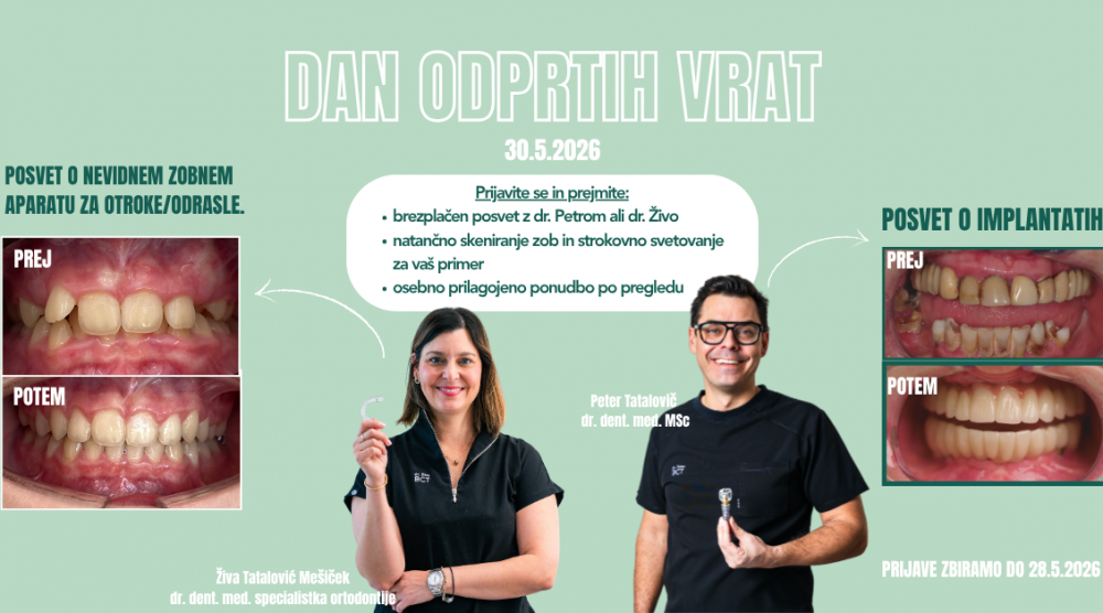 - brezplačen posvet pri dr. Petru za implantate ali dr. Živi za nevidni zobni aparat za odrasle in otroke